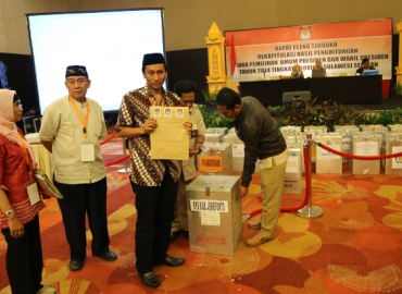 Surabaya, Badan Pengawas Pemilu - Rekapitulasi dan Penetapan Hasil Perhitungan Suara Pemilihan Umum Presiden dan Wakil Presiden Tahun 2014 sedang berlangsung di beberapa daerah, perolehan penghitungan pemilihan suara Pilpres 2014 kini telah sampai pada tahap penghitungan tingkat KPU Provinsi, terutama di Jawa Timur yang kini sedang melakukan kegiatan rekapitulasi tersebut di 38 Kabupaten/Kota.