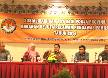 Yogyakarta, Bawaslu – Setelah mendapat dukungan dari sejumlah tokoh bangsa dalam sarasehan nasional di Jakarta beberapa hari lalu terkait pentingnya gerakan sejuta relawan pengawas Pemilu disosialisasikan dan perekrutan secara massif, Badan Pengawas Pemilu (Bawaslu) bersama Kelompok Kerja Nasional (Pokjanas) Gerakan Sejuta Relawan Pengawas Pemilu memulai agenda sosialisasi dan training of trainers (ToT) bagi Pokja Provinsi Gerakan Sejuta Relawan Pengawas Pemilu di Hotel Grand Quality, Yogyakarta, Jumat malam (31/1).