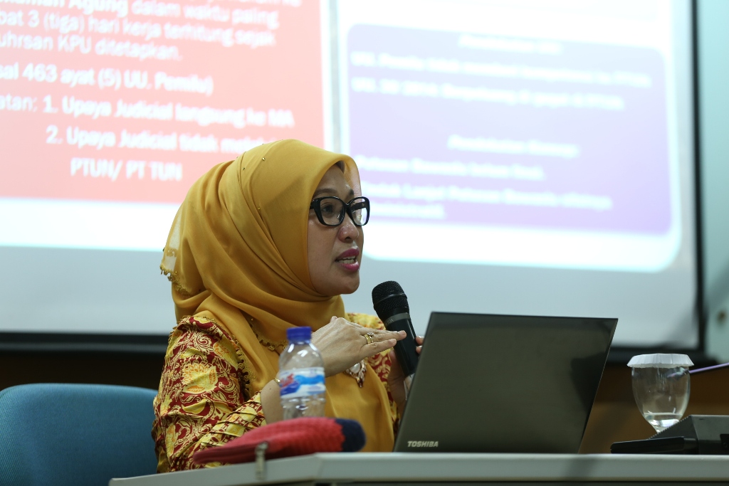 Bogor, Badan Pengawas Pemilihan Umum- Anggota Bawaslu RI Ratna Dewi Pettalolo memberikan materi pada kegiatan Pendidikan dan Pelatihan Teknis Fungsional Hakim Khusus Pemilu bagi Hakim Peradilan Tata Usaha Negara seluruh Indonesia, di Badan Litbang Diklat Kumdil Mahkamah Agung RI,Bogor, Rabu (22/11/2017).