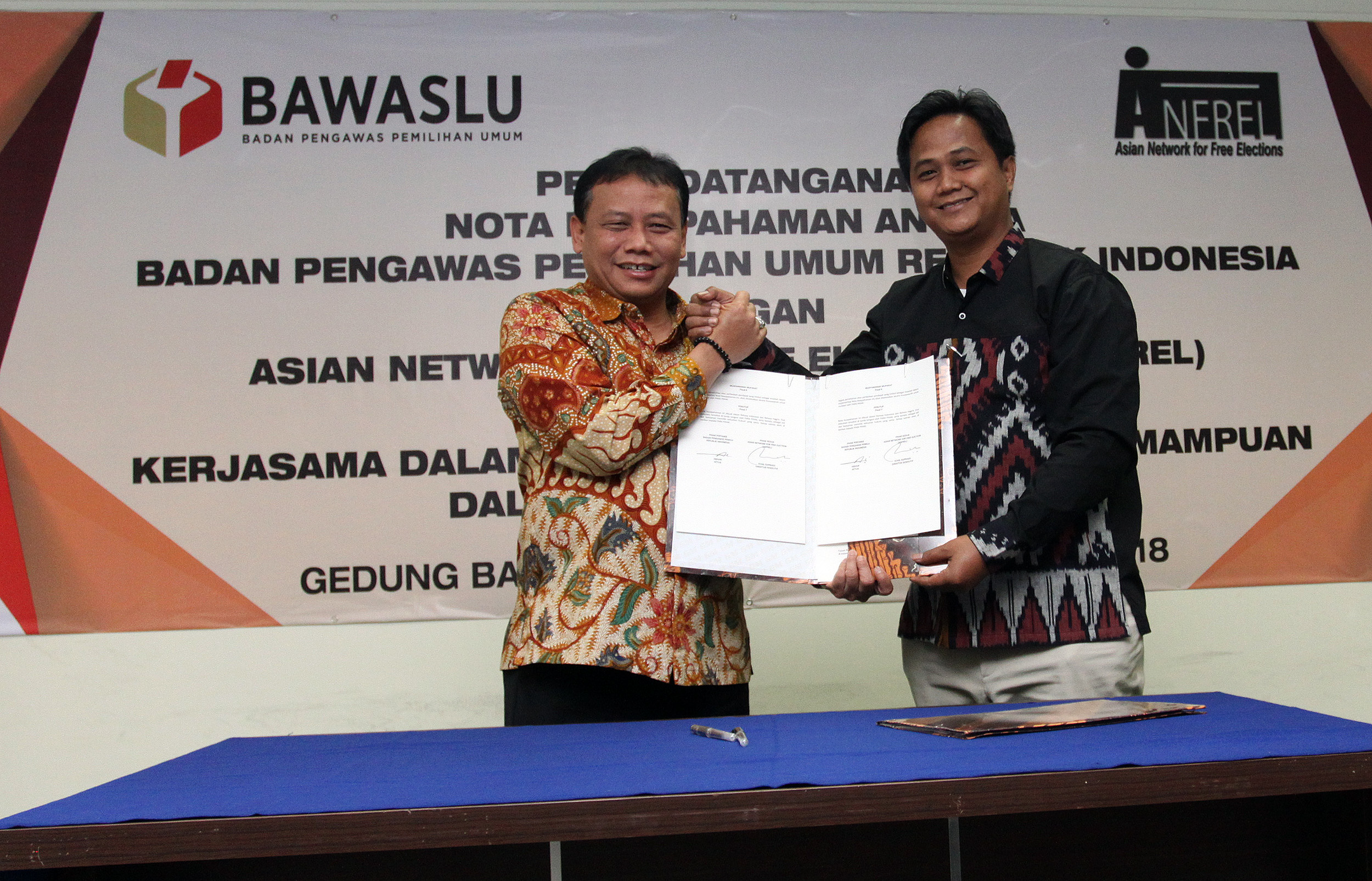 Nota kesepahaman ini ditandatangani Ketua Bawaslu RI Abhan sebagai pihak pertama dan Direktur Executive ANFREL Ichal Supriadi selaku pihak kedua. Penandatanganan ini digelar di Kantor Bawaslu RI, Jalan M.H. Thamrin 14, Jakarta Pusat, Selasa (16/1/2018).