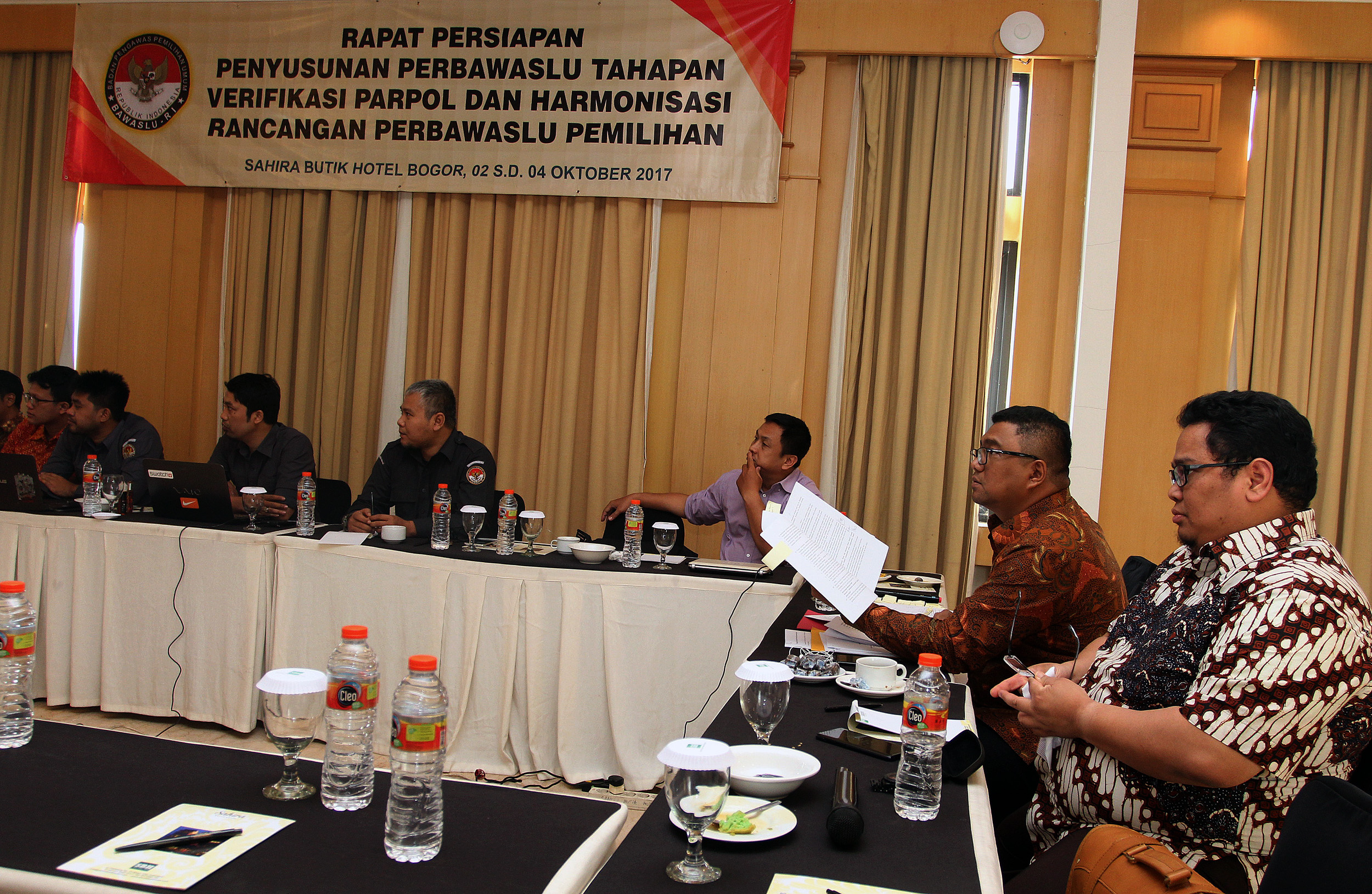 Bogor, Badan Pengawas Pemilu - Badan Pengawas Pemilu (Bawaslu) melakukan Rapat persiapan penyusunan Peraturan Bawaslu (Perbawaslu) yang mengatur mengenai pengawasan pada tahapan verifikasi partai politik dan harmonisasi rancangan Perbawaslu pemilihan di Sahira Butik Hotel, Bogor, Selasa (2/10/2017) siang. Rapat ini secara langsung dibuka oleh Koordinator Divisi Hukum Bawaslu RI, Fritz Edward Siregar.