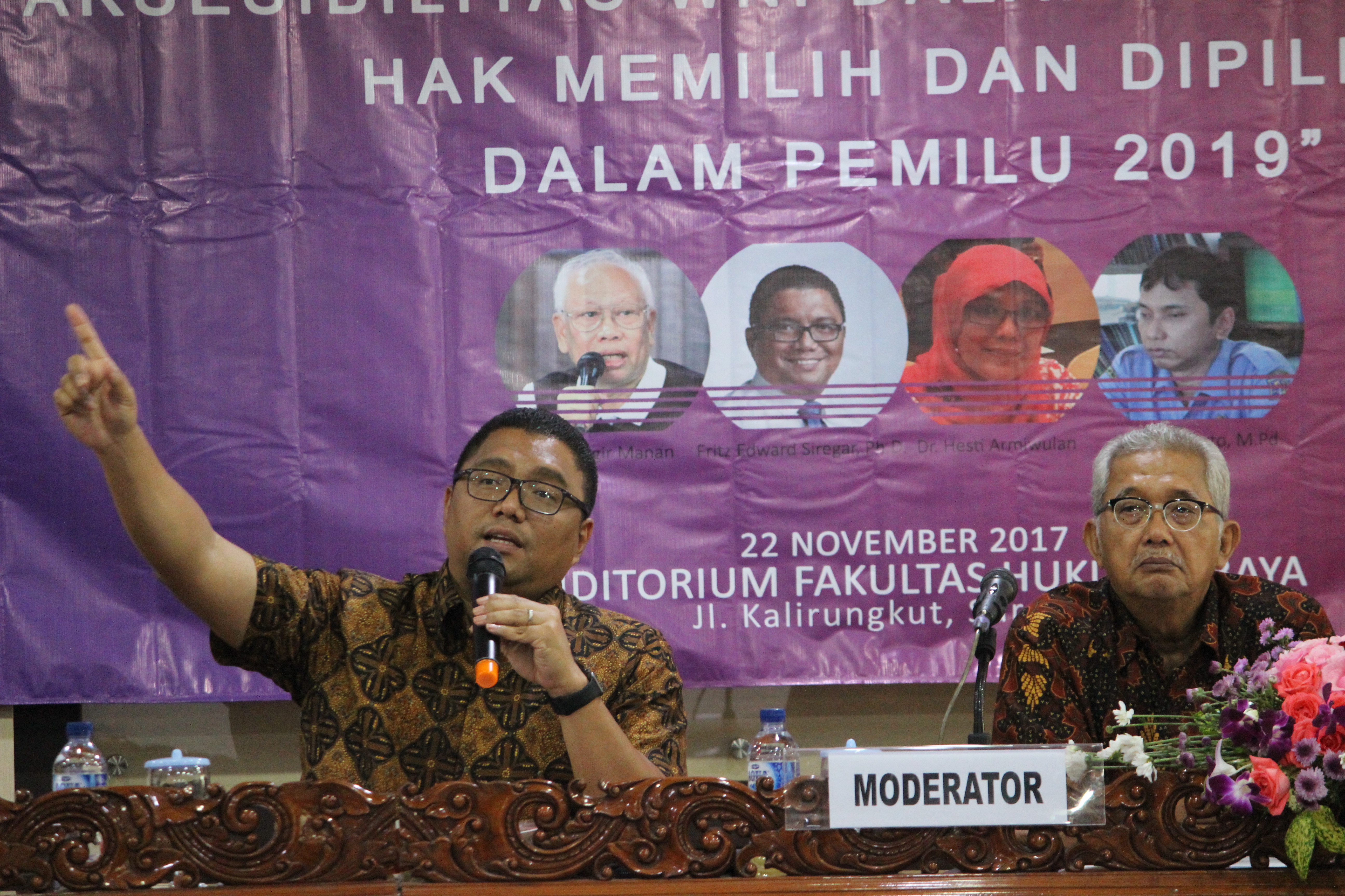 Seminar yang diselenggarakan oleh Fakultas Hukum UBAYA bersama Kemedagri tersebut juga menghadirkan narasumber antara lain mantan Ketua Mahkamah Agung Prof. Dr. Bagir Manan, Akademisi UBAYA Dr. Hesti Armiwulan, dan Atung Yunarto dari Pusat Pemilu Akses Penyandang Disabilitas (PPAPD) Jawa Timur.