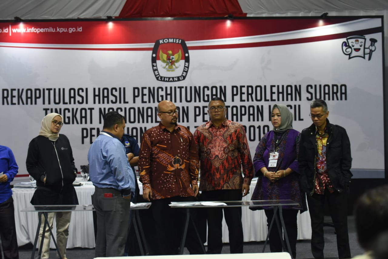 Anggota Bawaslu Fritz Edward Siregar (batik merah) saat melakukan pengawasan rekapitulasi suara nasional untuk provinsi Sumatra Selatan di kantor KPU, Selasa 14 Mei 2019/Foto: Abdul Hamid