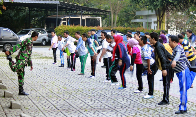 Bogor, Badan Pengawas Pemilu-Ketua Bawaslu RI, Abhan melakukan senam pagi bersama para anggota Bawaslu Provinsi terpilih masa jabatan 2017-2022 di halaman Aston Bogor Hotel ann Resort, Bogor, Jawa Barat, Minggu (24/9/2017). Senam tersebut dipimpin oleh instruktur Markas Komando dan Latihan Pasukan Pengaman Presiden (Makodenlat Paspamres) Group C.
