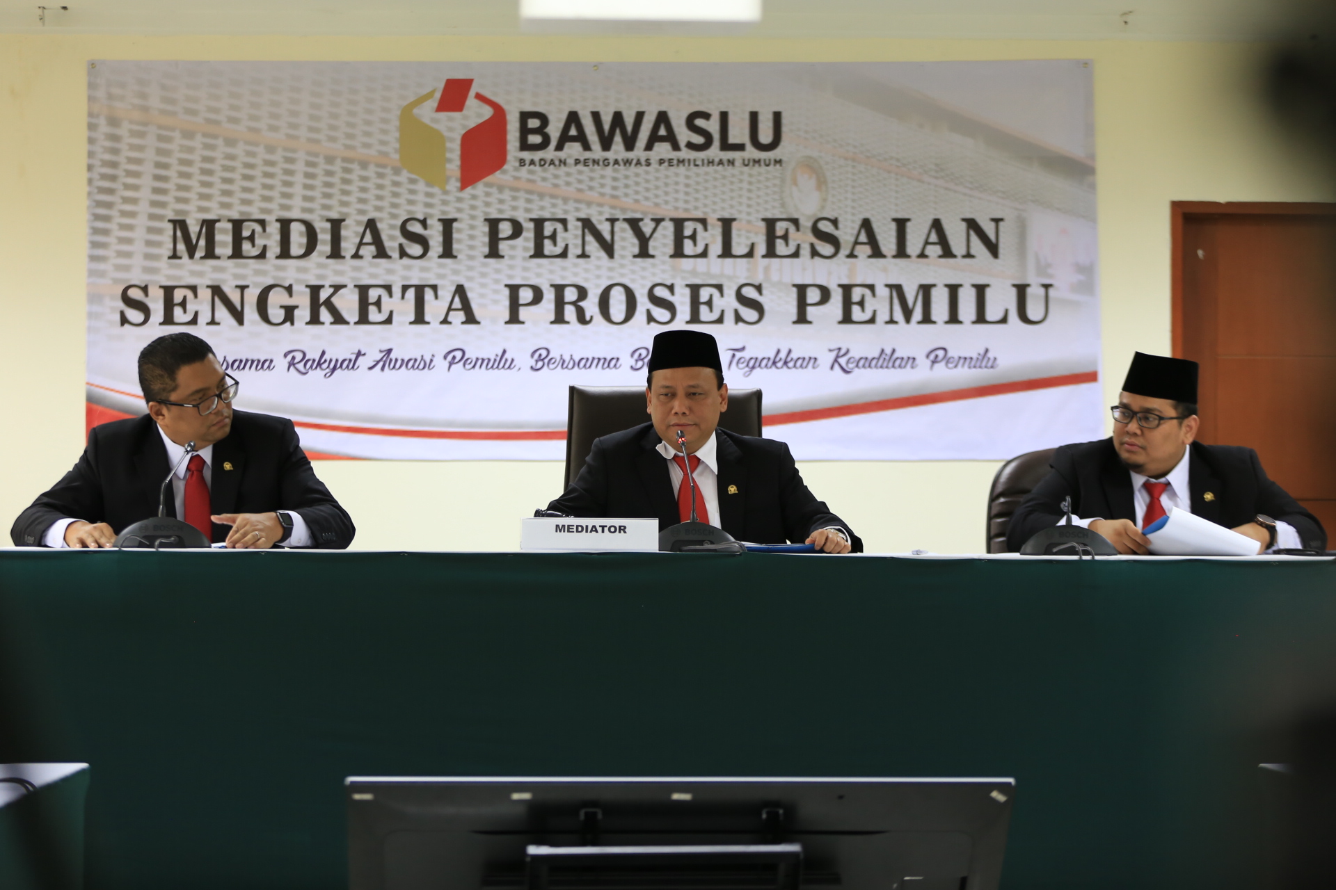 Putusan Terjadinya Kesepakatan Mediasi Penyelesaian Sengketa Proses Pemilu dibacakan oleh Ketua Bawaslu RI Abhan didampingi oleh Anggota Bawaslu RI, Fritz Edward Siregar dan Rahmat Bagja di Kantor Bawaslu, Sabtu (23/12/2017).