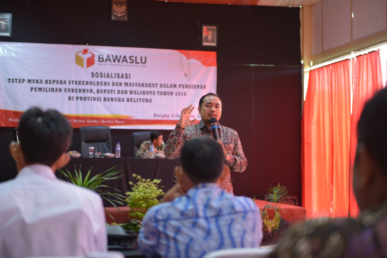 Pangkalpinang, Badan Pengawasan Pemilu - Anggota Bawaslu RI Mohammad Afifuddin, melakukan Sosialisasi Tatap Muka Kepada Stakholders dalam Persiapan Pemilihan Gubernur, Bupati dan Walikota Tahun 2018 di Provinsi Bangka Belitung, Rabu (6/12/2017). Afif mengatakan, forum ini adalah salah satu forum yang wajib dilaksanakan karena Bawaslu harus membangun sinergi dengan stakeholder terkait dan mengajak masyarakat di seluruh Indonesia untuk lebih aktif dalam melakukan pengawasan pelaksanaan Pemilu
