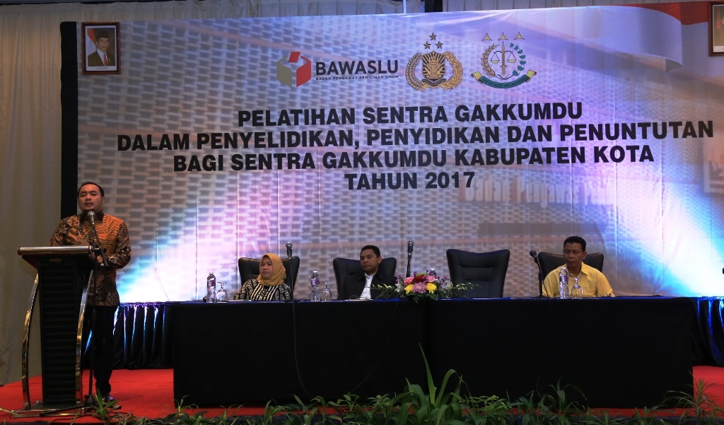 Jakarta, Badan Pengawas Pemilihan Umum - Dalam rangka meningkatkan kualitas Sentra Penegakan Hukum Terpadu (Gakkkumdu) dalam menangani perkara dugaan pelanggaran tindak pidana Pilkada 2018 dan Pemilu 2019, Bawaslu RI menggelar Pelatihan Sentra Gakkumdu dalam Penyelidikan, Penyidikan, dan Penuntutan bagi Sentra Gakkumdu Kabupaten/Kota Tahun 2017, sejak Selasa (12/12/17) hingga Kamis (14/12/17)