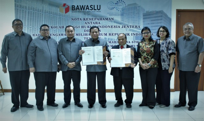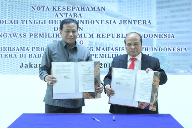 Jakarta, Badan Pengawas Pemilihan Umum- Badan Pengawas Pemilihan Umum (Bawaslu) melakukan kerjasama dengan Sekolah Tinggi Hukum Indonesia (STHI) Jentera untuk meningkatkan partisipasi masyarakat dalam Pengawasan Pemilu. Kerjasama itu juga untuk meningkatkan penguatan sektor hukum di Bawaslu.