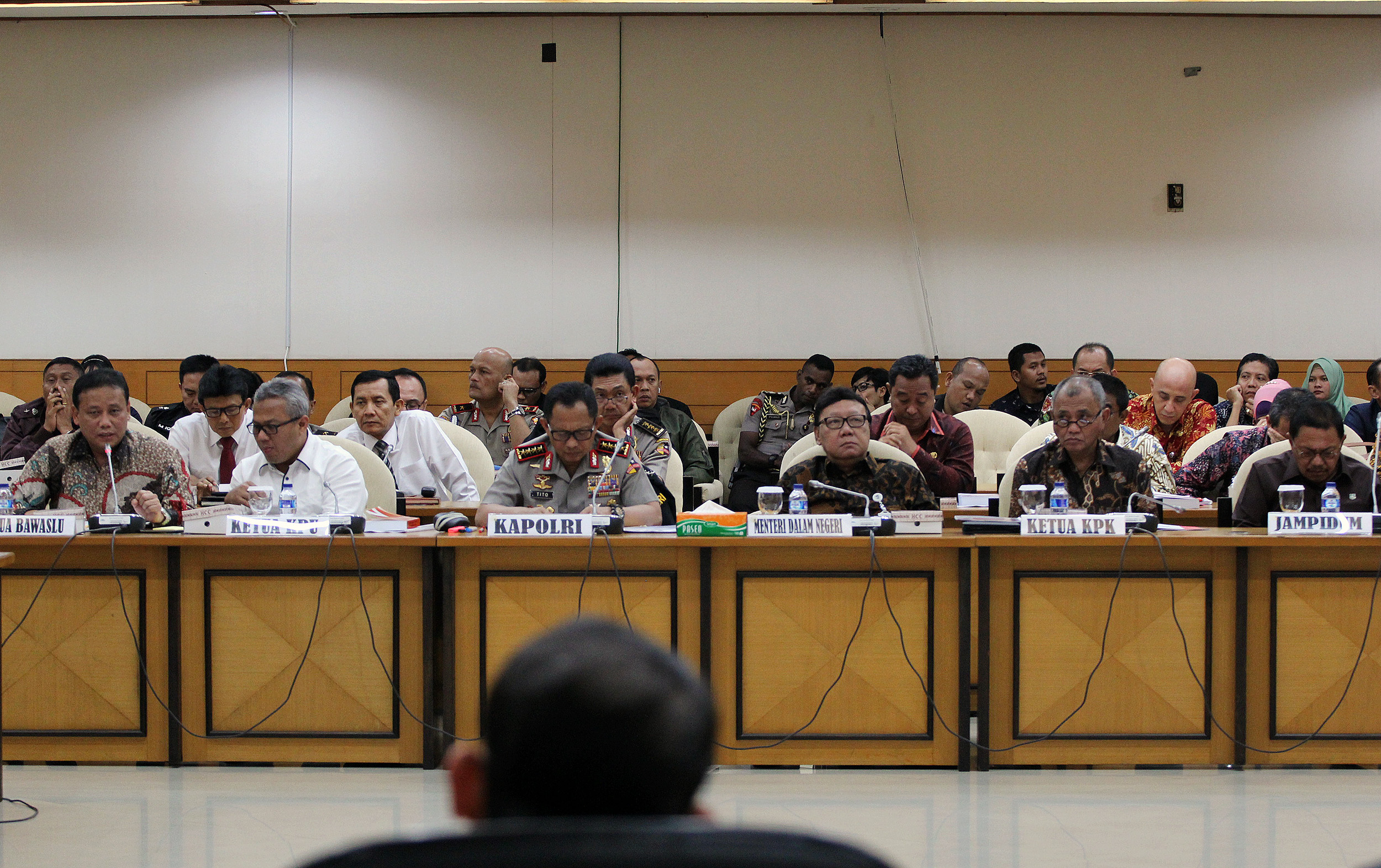 Jakarta, Badan Pengawas Pemilu - Pimpinan DPR menggelar rapat konsultasi dengan seluruh jajaran aparat penegak hukum, penyelenggara pemilu, pemerintah, serta komisi terkait untuk mempersiapkan pelaksananaan pilkada serentak di 171 wilayah tahun 2018. Rapat yang dihadiri Kapolri Jendral Pol Tito Karnavian, Jampidum Noorachmad, Ketua Bawaslu RI Abhan, Ketua KPU RI Arief Budiman, Mendagri Tjahjo Kumolo, dan Ketua KPK Agus Rahardjo dipimpin langsung oleh Fadli Zon selaku Plt Ketua DPR RI.