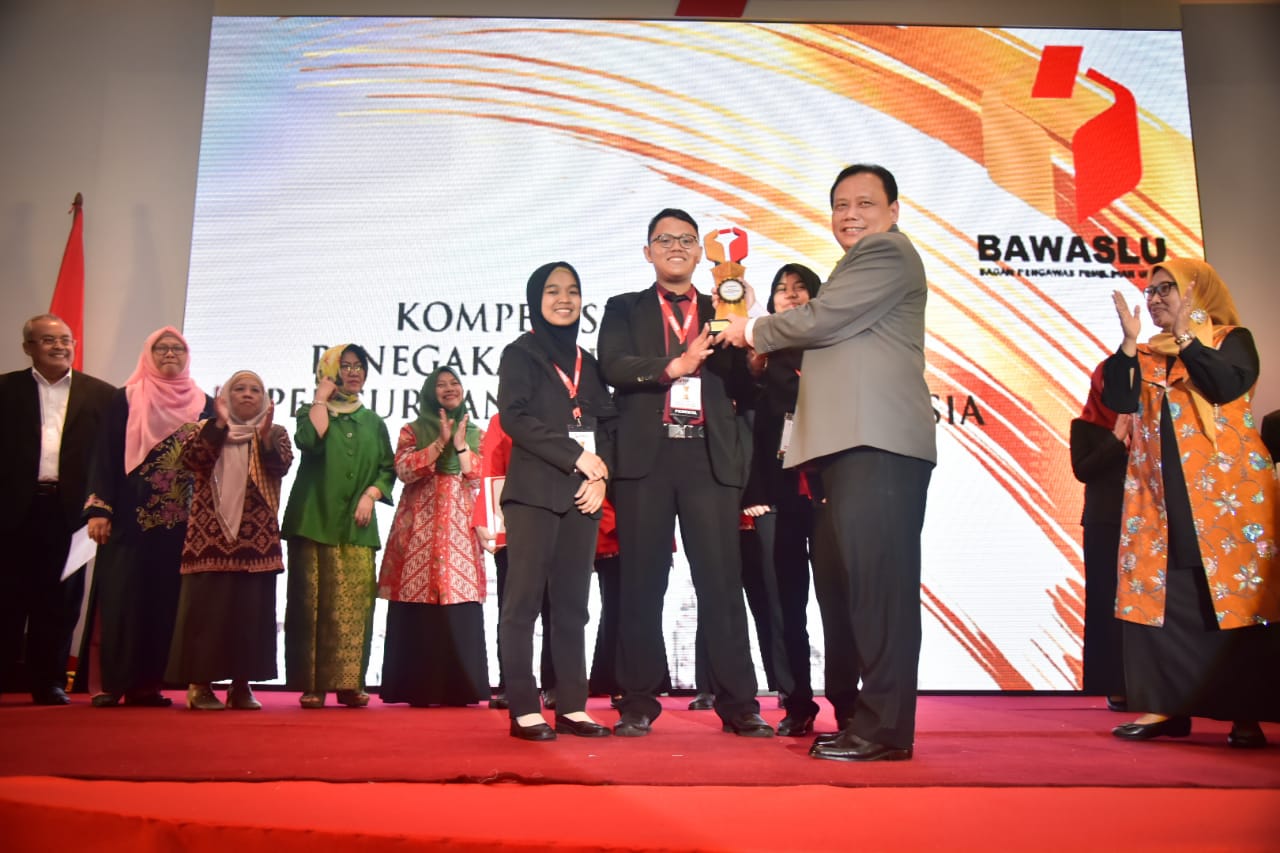 Ketua Bawaslu Abhan memberikan piagam penghargaan Juara I kepada peserta dari Universitas Andalas di akhir Kompetisi Debat Penegakan Hukum Pemilu Perguruan Tinggi se-Indonesia yang berlangsung di Jakarta, Senin (16/12/2019) malam/Foto: Muhtar