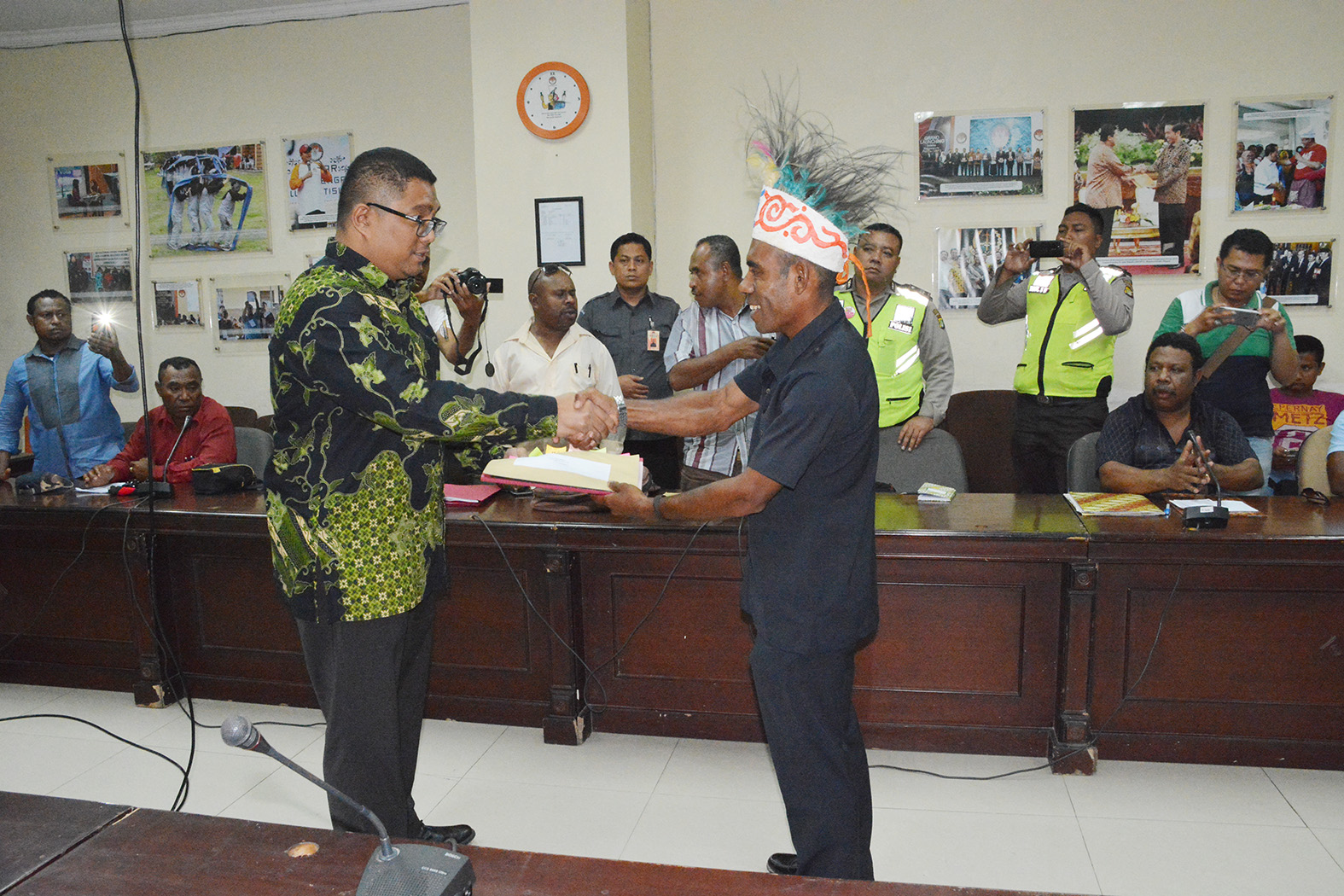 Setelah melakukan orasinya, kemudian perwakilan dari Kabupaten Kepulauan Yapen yang terdiri dari Samir sebagai Ketua Rombongan dan perwakilan masyarakat adat suku Kusami, Yonas dari perwakilan suku Kaitimu, Mesakh Karebo, Benyamin Wenu perwakilan adat suku Yawanua, serta Kepala Suku Kepulauan Yapen diterima oleh Anggota Bawaslu Fritz Edward Siregar.