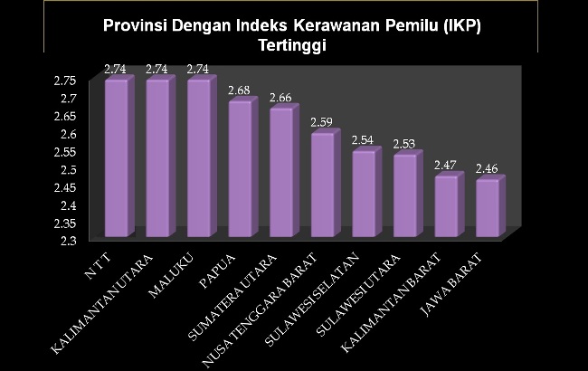 Aspek yang digunakan dalam merumuskan IKP antara lain, aspek Profesionalitas Penyelenggara dengan bobot (30), Aspek Politik Uang (20), Aspek Akses Pengawasan (15), Aspek Partisipasi Masyarakat (20), dan Aspek Keamanan Daerah (15). Indeks untuk kategori sangat aman (0-1), kategori aman (1-2), kategori cukup rawan (2,1-3), kategori rawan (3,1-4), dan kategori sangat rawan (4,1-5).