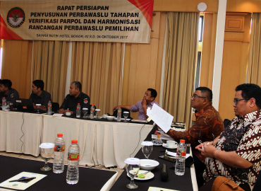 Bogor, Badan Pengawas Pemilu - Badan Pengawas Pemilu (Bawaslu) melakukan Rapat persiapan penyusunan Peraturan Bawaslu (Perbawaslu) yang mengatur mengenai pengawasan pada tahapan verifikasi partai politik dan harmonisasi rancangan Perbawaslu pemilihan di Sahira Butik Hotel, Bogor, Selasa (2/10/2017) siang. Rapat ini secara langsung dibuka oleh Koordinator Divisi Hukum Bawaslu RI, Fritz Edward Siregar.