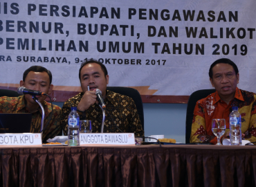Surabaya, Badan Pengawas Pemilu -Bawaslu RI menggelar Rapat Kerja Teknis (Rakernis) Persiapan Pengawasan dalam Pemilihan Gubernur, Bupati, dan Walikota Tahun 2018, serta Pemilihan Umum Tahun 2019 di Surabaya, Senin (9/10/2017) hingga Selasa (10/10/2017),
