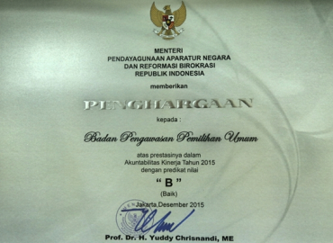 Jakarta, Badan Pengawas Pemilu - Bawaslu menerima penghargaan atas prestasinya dalam Akuntabilitas Kinerja Tahun 2015 dengan predikat nilai “B” (Baik) dari Kementerian Pendayagunaan Aparatur Negara dan Reformasi Birokrasi (KEMENPAN RB) di Istana Wakil Presiden. Penyerahan penghargaan dilakukan oleh Wapres Jusuf Kalla di Jakarta, Selasa (15/12). Hadir dalam kesempatan itu Ketua Bawaslu RI Muhammad bersama dengan Sekretaris Jenderal Gunawan Suswantoro.