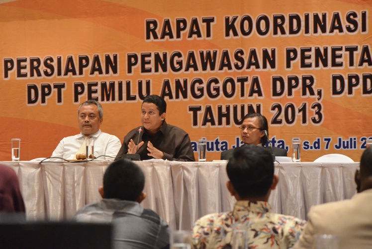 Jakarta, Bawaslu – Badan Pengawas Pemilu (Bawaslu) menggelar Rapat Koordinasi (Rakor) Persiapan Pengawasn Penetapan Daftar Pemilih Sementara (DPS) dan Daftar Pemilih Tetap (DPT) Pemilu Anggota Dewan Perwakilan Rakyat (DPR), Dewan Perwakilan Daerah (DPD) dan Dewan Perwakilan Rakyat Daerah (DPRD) Tahun 2014 di Jakarta, Jumat (5/7).