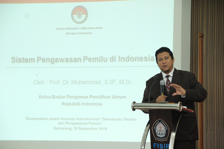 Ketua Bawaslu RI Prof. Dr. Muhammad, S.IP, M.Si saat memaparkan materi dalam seminar internasional bertajuk “Demokrasi, Pemilu dan Pengawasan Pemilu” di Gedung Auditorium FISIP Undip, Semarang, Senin (19/9).