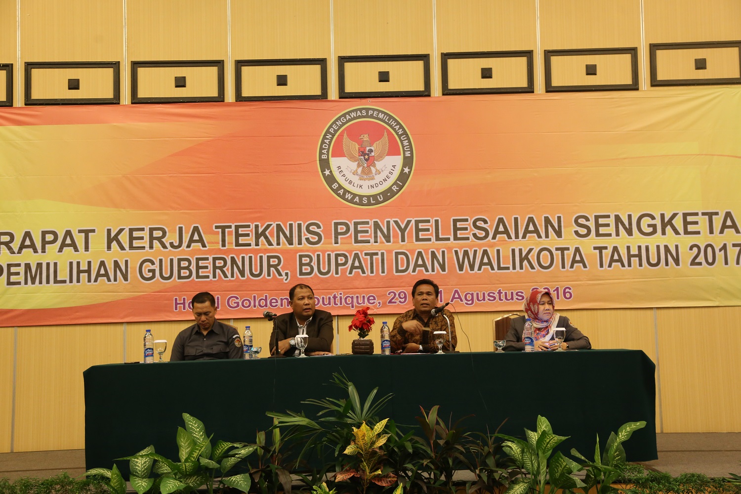 Jakarta, Badan Pengawas Pemilu - Guna mematangkan jajaran pengawas pemilihan di tingkat kabupaten/kota dalam menyelesaikan sengketa pemilihan pada Pilkada 2017 mendatang, Bawaslu RI menggelar Rapat Kerja Teknis (Rakernis) Penyelesaian Sengketa Pemilihan Gubernur, Bupati, dan Walikota Tahun 2017 selama tiga hari sejak Senin (29/8) hingga Rabu (31/8) di Hotel Golden Boutiqe Jakarta.