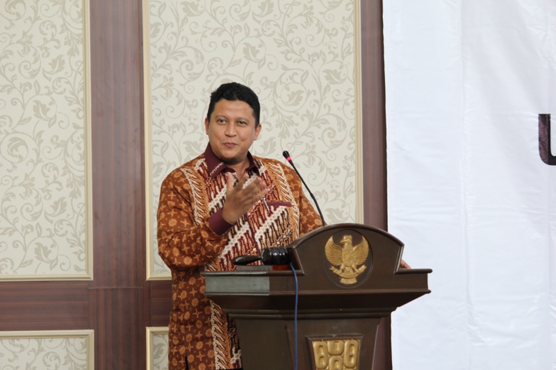 Ketua Bawaslu RI Prof. Dr. Muhammad, S.IP., M.Si saat menyampaikan materi kegiatan Sosialisasi Undang – Undang Nomor 10 Tahun 2016 Tentang Pemilihan Gubernur, Bupati dan Walikota yang diselenggarakan oleh Research and Consultant Pemantau dan Evaluasi Otonomi Daerah bersama Pascasarjana Universitas Muhammadiyah Malang dan Pemerintah Kota Batu di Gedung Graha Pancasila Balaikota Among Tani Pemkot Batu, Senin (03/10).
