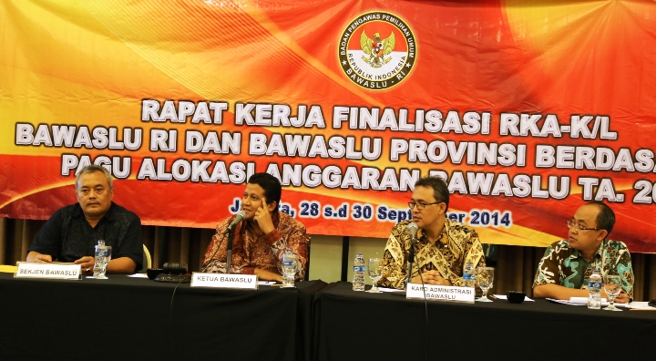 Jakarta, Badan Pengawas Pemilu- Sebanyak 33 Bawaslu Provinsi mengikuti Rapat Kerja Finalisasi RKA-K/L Bawaslu RI dan Bawaslu Provinsi berdasarkan Pagu alokasi Anggaran Bawaslu TA. 2015. Raker tersebut dihadiri oleh seluruh Kepala sekretariat dan Bendahara Bawaslu Provinsi. Acara dilaksanakan di Hotel Millenium, Jakarta Pusat, Minggu-Selasa (28-30/9).