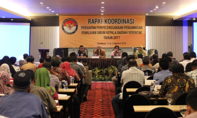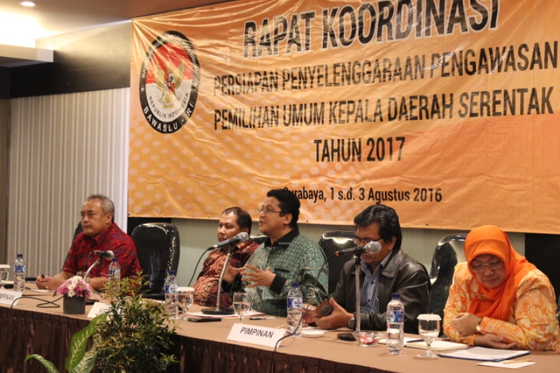 Surabaya, Badan Pengawas Pemilu – Pelaksanaan tahapan pemilihan kepala daerah serentak tahun 2017 pada 101 daerah di Indonesia segera dimulai. Demi tercapainya kesiapan yang maksimal pada pengawasan Pilkada tersebut, Bawaslu menggelar Rapat Koordinasi Persiapan Penyelenggaraan Pengawasan Pilkada Tahun 2017 yang dilaksanakan pada tanggal 1 sampai dengan 3 Agustus 2016 di Hotel Aria Centra, Surabaya.