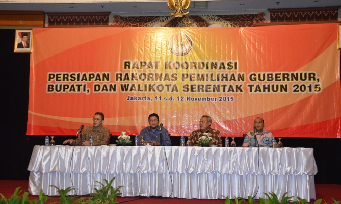 Ketua Bawaslu RI Muhammad mengajak jajaran pengawas dari seluruh Indonesia untuk bersama satukan semangat dan kekuatan dalam mengawasi Pilkada tahun 2015 dalam Rapat Koordonasi Persiapan Rakornas Pemilihan Gubernur, Bupati, Walikota Serentak Tahun 2015 di Hotel Grand Sahid Jaya, Rabu (11/11).