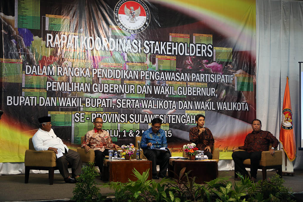 Palu, Badan Pengawas Pemilu – Menghadapi Pemilukada Serentak yang akan dilaksanakan bulan Desember 2015 di 269 daerah seluruh Indonesia, Bawaslu RI menggelar Rapat Koordinasi Stakeholders dalam rangka pendidikan partisipatif pemilihan gubernur dan wakil gubernur, bupati dan wakil bupati, serta walikota dan wakil walikota se-Provinsi Sulawesi Tengah di Palu. Bawaslu ingin melihat sejauh mana peran dan dukungan pemerintah daerah dari sisi anggaran, fasilitas, sumber daya manusia, serta sarana dan prasarana menjelang Pemilukada tersebut. Hal ini diutarakan Pimpinan Bawaslu RI Nasrullah pada sambutan pembukaan acara Rapat Koordinasi, Jumat (1/5).