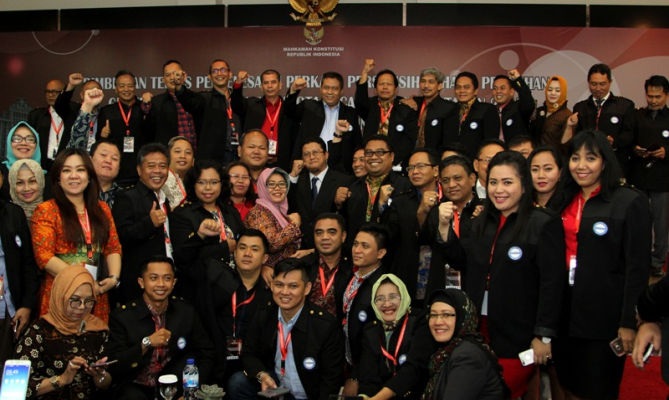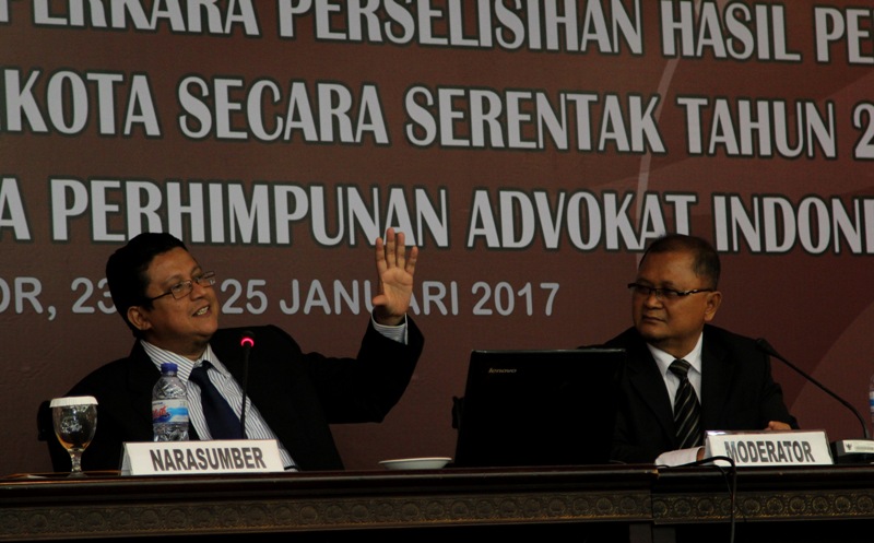 Bogor, Badan Pengawas Pemilu -. Sebanyak 156 perwakilan anggota dan pengurus Dewan Pimpinan Nasional (DPN) Perhimpuan Advokat Indonesia (Peradi) seluruh Indonesia bersama MK (Mahkamah Konstitusi) menggelar Bimbingan Teknis Penyelesaian Perkara Perselihan Hasil Pemilihan Gubernur, Bupati, dan Walikota (PHP Kada) Serentak Tahun 2017 bertempat di Pusat Pendidikan Pancasila dan Konstitusi Mahkamah Konstitusi, Bogor. Acara yang berlangsung selama tiga hari (23 s/d 25) ini dibuka langsung oleh Sekretaris Jenderal MK M. Guntur Hamzah, Senin (23/1).
