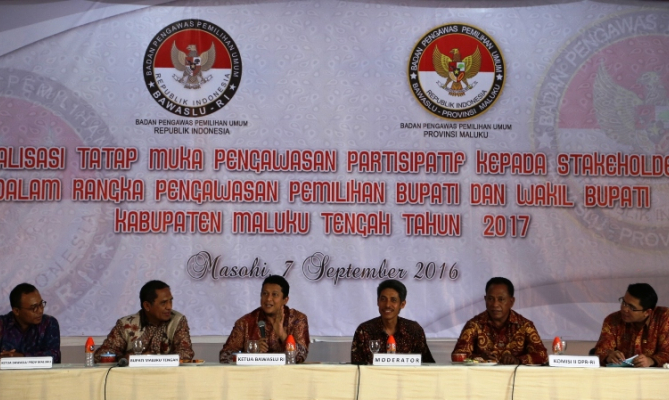 Kali ini Bawaslu menyelenggarakan kegiatan Sosialisasi Tatap Muka Pengawasan Partisipatif Kepada Stakeholder Dalam Rangka Pengawasan Pemilihan Bupati dan Wakil Bupati Tahun 2017, di Masohi, Kabupaten Maluku Tengah, Provinsi Maluku, Rabu siang (7/09).