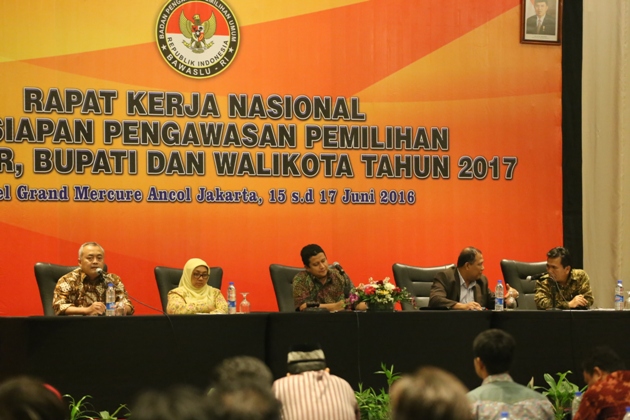 Pimpinan Bawaslu RI saat menghadiri Rapat Kerja Nasional (Rakernas) Persiapan Pengawasan Pemilihan Gubernur, Bupati, dan Walikota Tahun 2017, di Hotel Mercure Ancol Jakarta, Kamis (16/6).