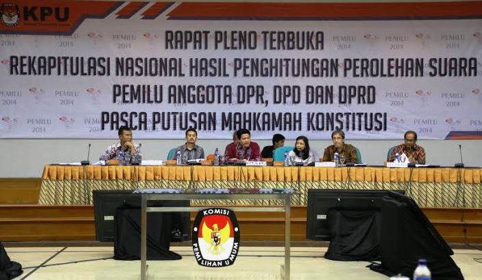 Jakarta, Badan Pengawas Pemilu - Komisi Pemilihan Umum Republik Indonesia menggelar Rapat Pleno terbuka rekapitulasi Nasional hasil Penghitungan Perolehan Suara Pemilu anggota DPR, DPD dan DPRD pasca Putusan Mahkamah Kontitusi. Minggu 28 September 2014.