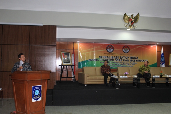 Ketua Bawaslu RI Prof. Muhammad saat berbicara sebagai nara sumber dalam sosialisasi tatap muka bersama stakeholder dan masyarakat dalam rangka Pilgub di Kantor Gubernur Kepulauan Bangka Belitung, Selasa (21/6). Ketua Bawaslu memberi contoh modus yang dilakukan oknum Panitia Pemungutan Suara di TPS dalam memanipulasi jumlah suara yang diperoleh pasangan calon sesuai kepentingan pihak yang membayar oknum PPS tersebut.