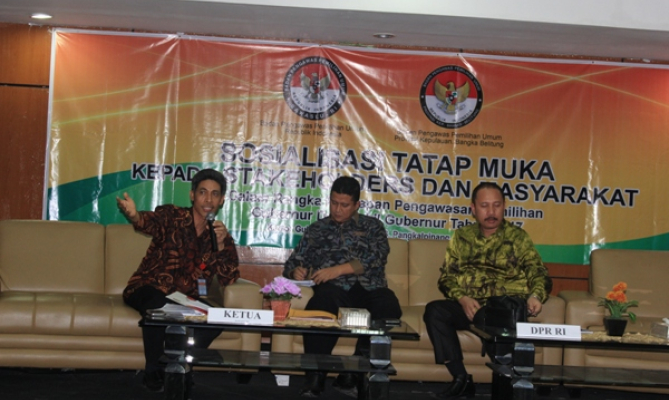 Sosialisasi tatap muka Bawaslu bersama stakeholder dan mayarakat dalam rangka Pilkada yang berlangsung di Kantor Gubernur Kepulauan Bangka Belitung dihadiri sekitar 100 orang. Nara sumber utama dalam sosialisasi tersebut adalah Ketua Bawaslu Prof. Muhammad dan Anggota Komisi II DPR RI Muhammad Nur Purnamasidi dengan moderator tenaga ahli Bawaslu, Saparuddin.