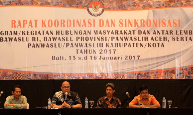 Badung, Badan Pengawas Pemilu – Badan Pengawas Pemilu Republik Indonesia, (Bawaslu RI) mengadakan Rapat Koordinasi dan Sinkronisasi Program Kegiatan Hubungan Masyarakat dan Antar Lembaga Bawaslu RI, Bawaslu Provinsi/ Panwaslih Aceh, serta Panwaslu/ Panwaslih Kabupaten/Kota Tahun 2017, bertempat di Golden Tulip Hotel, Badung, Bali, Minggu (15/1).