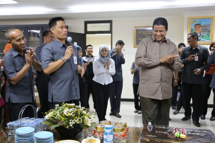 Pagi ini di dalam ruang kerja Ketua Bawaslu Muhammad beberapa pejabat struktural beserta para staf di lingkungan Sekretariat Jenderal Bawaslu RI berkumpul memberikan ucapan selamat sambil berjabat tangan di dalam suasana yang penuh kekeluargaan. "Para pejabat dan teman-teman staf yang saya cintai, sungguh suatu kejutan buat saya, terima kasih sekali. Saya sangat terharu di dalam suasana kekeluargaan ini berkenan hadir di ruangan saya, menyampaikan milad (Ulang Tahun,-red) saya, sulit membahasakan rasa senang saya pada saat ini. Saya juga berdoa agar kita (seluruh jajaran Bawaslu RI,-red) bisa bekerja dengan baik, saya ini seperti biji sebatang saja, tidak ada artinya tanpa saudara-saudara. jika Insya Allah lembaga kita bisa lebih baik dari sekarang, itu merupakan kerja dari teman-teman, saudara-saudaraku semua, tanpa kecuali," tegas Muhammad dalam sambutanya. Di dalam acara yang sama, Muhammad menyampaikan permohonan maaf yang sebesar-besarnya kepada seluruh jajaran Bawaslu. "Semoga kedepannya saya bisa bekerja lebih baik lagi, berkat dukungan dan doa dari saudara-saudara sekalian," lanjutnya.