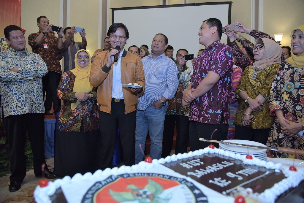 Bapak Daniel Zuchron yang selama ini menjadi Koordinator Divisi Pengawasan di Bawaslu RI tak hilang akal untuk mencairkan suasana. Secara simbolis ia menyerahkan potongan pertama kue ulang tahun kepada perwakilan Staf Protokol yang dianggap berjasa dalam mengamankan berbagai proses kegiatan Bawaslu RI.