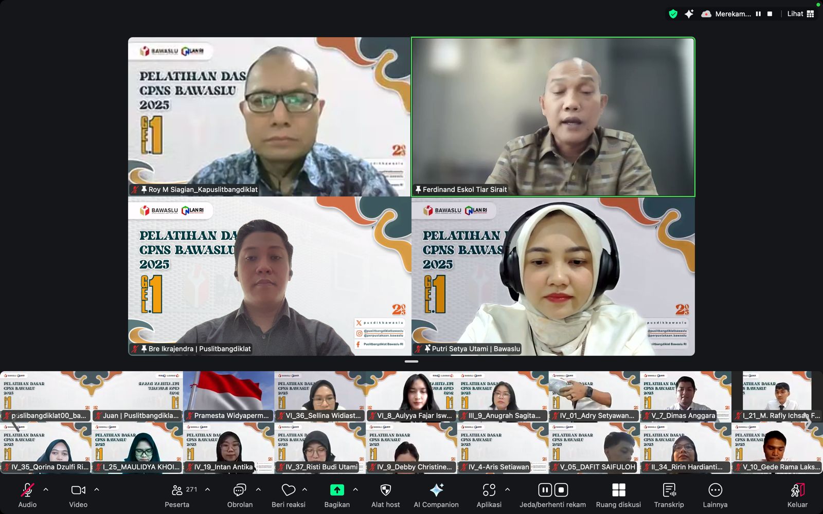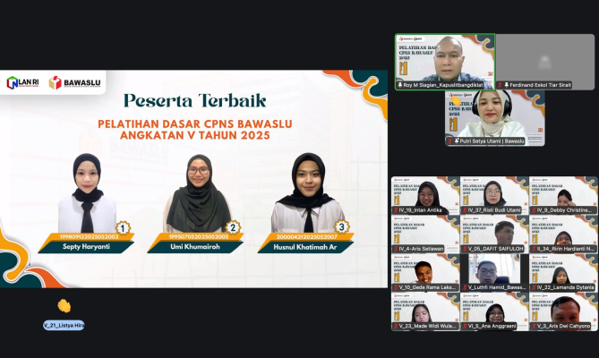 Tangkapan layar Sekretaris Jenderal Bawaslu Ferdinand Eskol Tiar Sirait (kanan atas) saat menutup Pelatihan Dasar (Latsar) CPNS Golongan II dan III Gelombang 1 Angkatan 1–6 Bawaslu Tahun 2025, yang digelar secara daring, Kamis (6/11/2025).