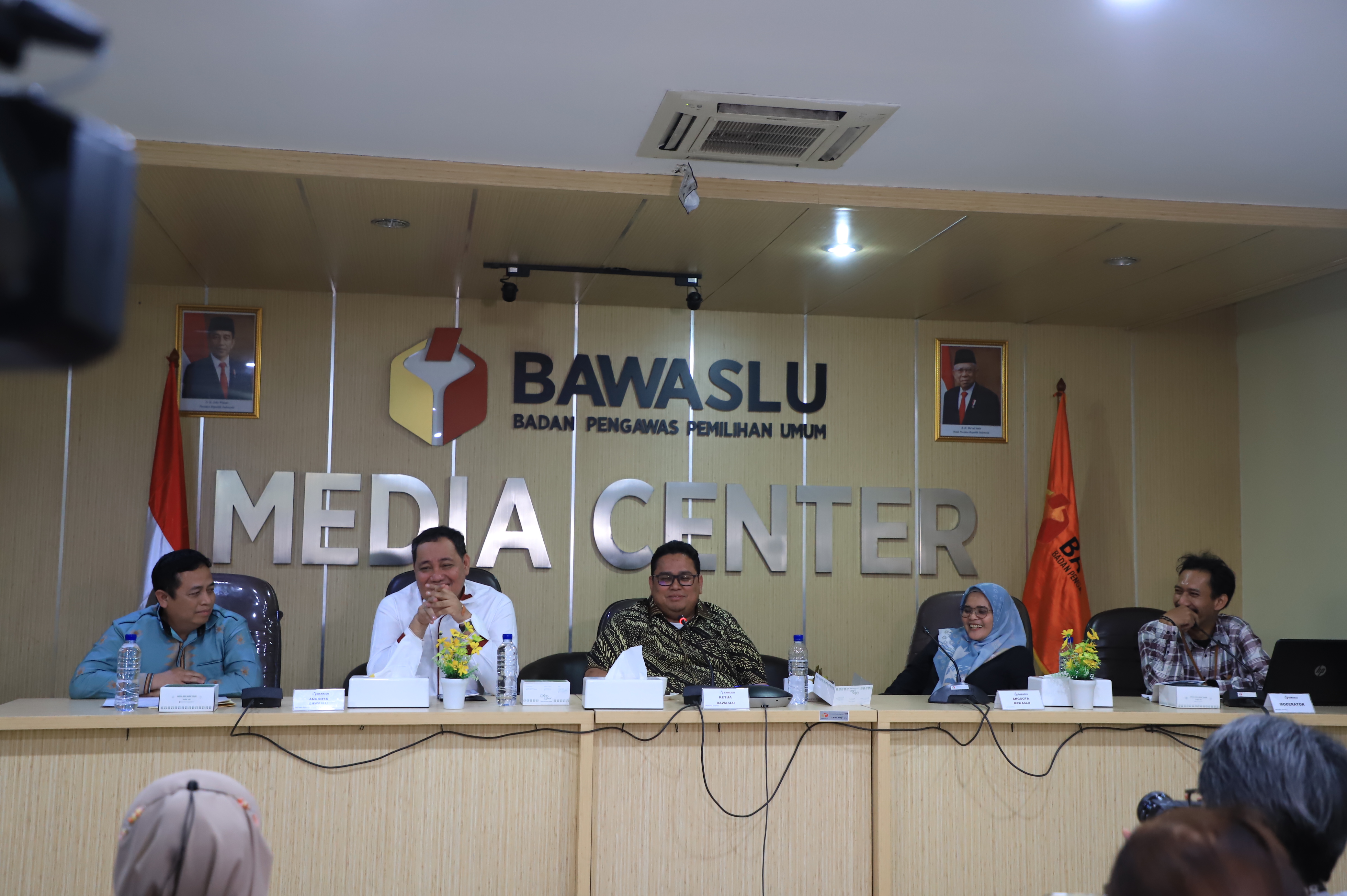 Ketua dan Anggota Bawaslu memberikan catatan hasil pengawasan tahapan pemilu sepanjang tahun 2022 di Media Center Bawaslu, Kamis (5/1/2023)