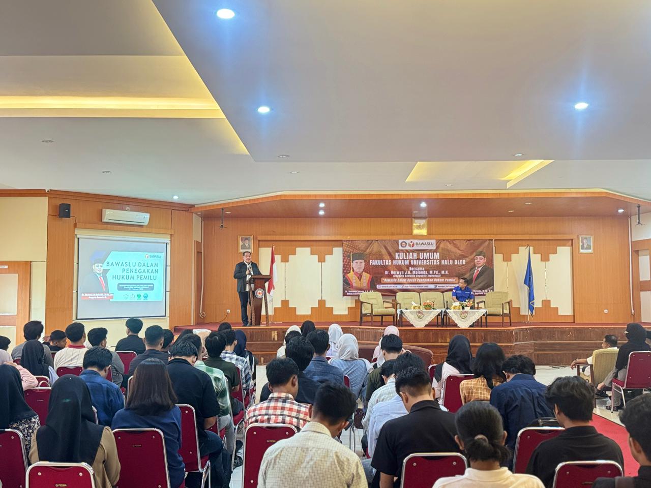 Kendari, Badan Pengawas Pemilihan Umum – Anggota Bawaslu Herwyn J. H. Malonda memberikan kuliah umum Hukum Pemilu di Aula Fakultas Hukum Universitas Halu Oleo (UHO). Kegiatan ini menjadi bagian dari penguatan literasi kepemiluan serta pemahaman mahasiswa terhadap sistem dan penegakan hukum pemilu di Indonesia.
