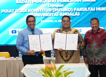 Padang, Badan Pengawas Pemilihan Umum - Ketua Bawaslu Rahmat Bagja mengungkapkan Nota Kesepahaman dengan Pusat Studi Konstitusi (PUSaKO) Fakultas Hukum Universitas Andalas dilakukan untuk mendorong atau mendukung sumber daya manusia (SDM) khususnya pada pengawasan pemilu.