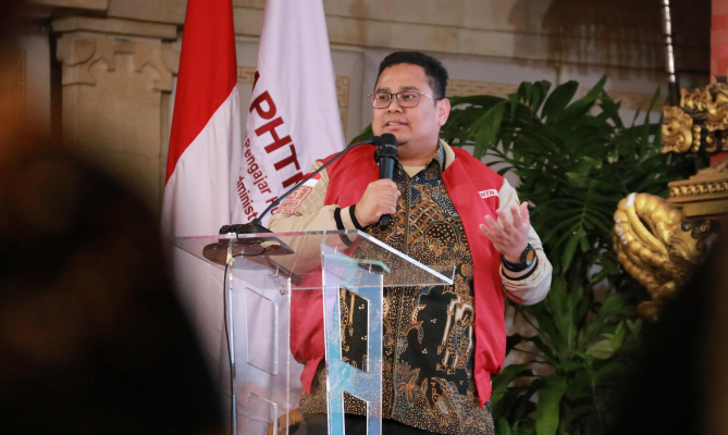 Ketua Bawaslu Rahmat Bagja dalam Seminar Nasional dalam rangka Pelaksanaan Musyawarah Nasional ke VII yang diselenggarakan oleh Asosiasi Pengajar Hukum Tata Negara dan Hukum Administrasi Negara (APHTN-HAN) di kawasan Sanur, Bali, Jumat (25/4/2025). /foto: Humas Bawaslu Provinsi Bali