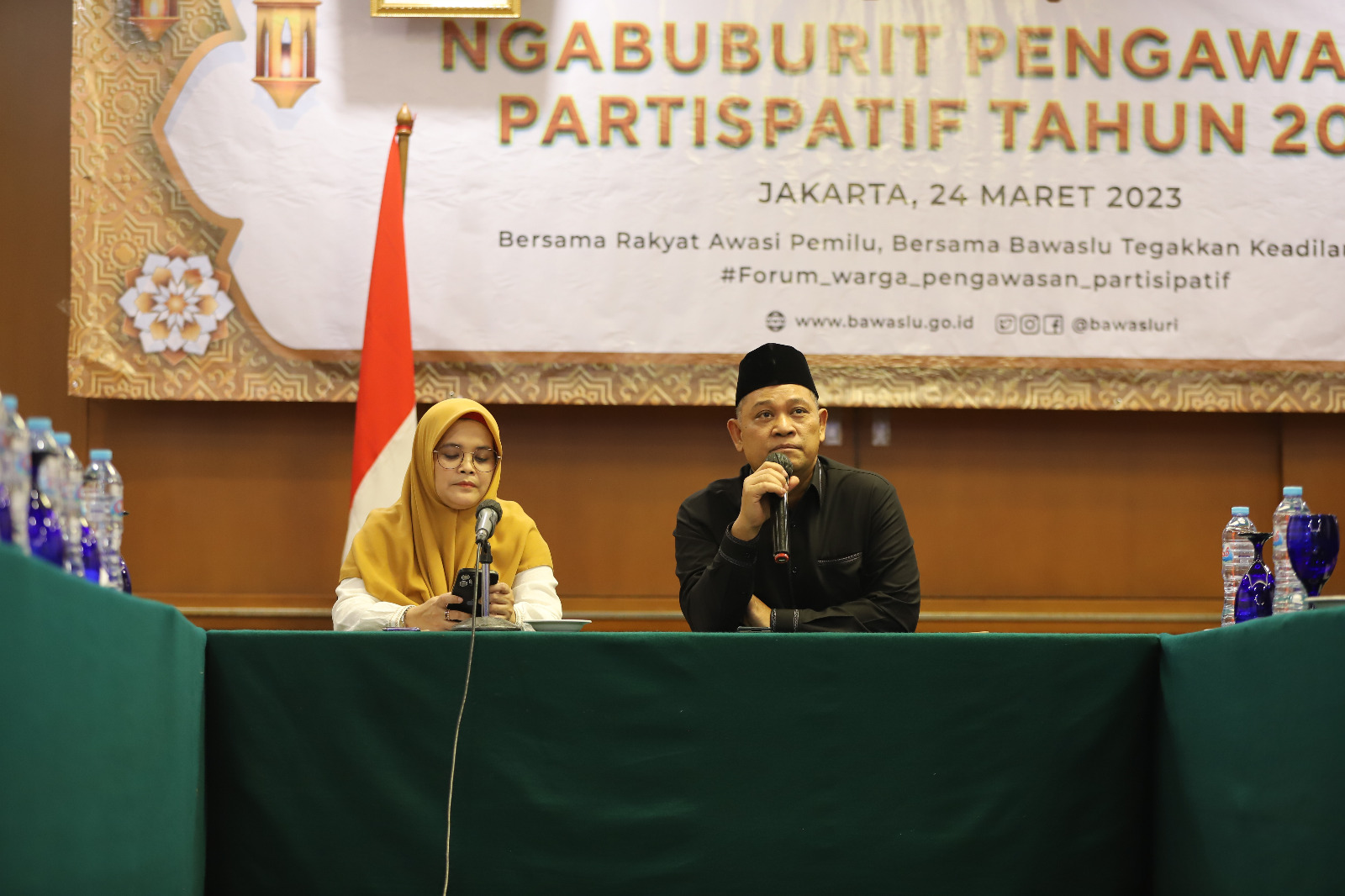 Anggota Bawaslu Totok Hariyono bersama Anggota Bawaslu Lolly Suhenty dalam peluncuran Ngabuburit Pengawasan Partisipatif 2023 yang dilakukan secara hybrid di Jakarta, Jumat (24/3/2023).