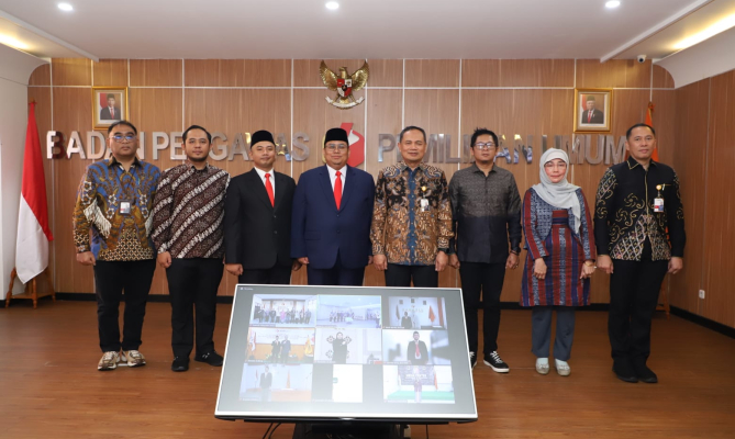 Jakarta, Badan Pengawas Pemilihan Umum - Ketua Bawaslu Rahmat Bagja melantik sembilan Anggota Bawaslu kabupaten/kota dan Panitia Pengawas Luar Negeri (Panwas LN) sekaligus mengambil sumpah jabatan Pengganti Antar Waktu (PAW). Pelantikan ini dilakukan luar jaringan (luring) di Kantor Bawaslu RI dan dalam jaringan (daring) dari Kantor Bawaslu setempat.