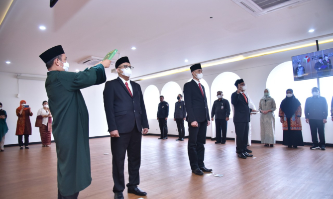 Ketua Bawaslu Rahmat Bagja melantik sekaligus mengambil sumpah tiga anggota Bawaslu Provinsi DKI Jakarta masa jabatan 2022-2027, di Kantor Bawaslu, Senin (17/10/2022).