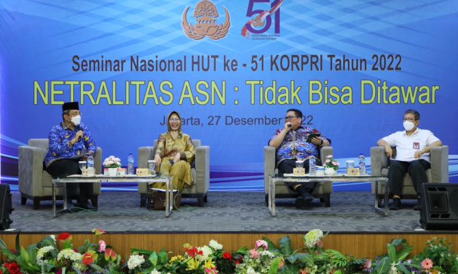 Ketua Bawaslu Rahmat Bagja (ketiga dari kiri) saat menjadi pembicara dalam seminar HUT ke-51 KORPRI bertajuk"Netralitas ASN: Tak Bisa Ditawar Lagi", Selasa (27/12/2022).