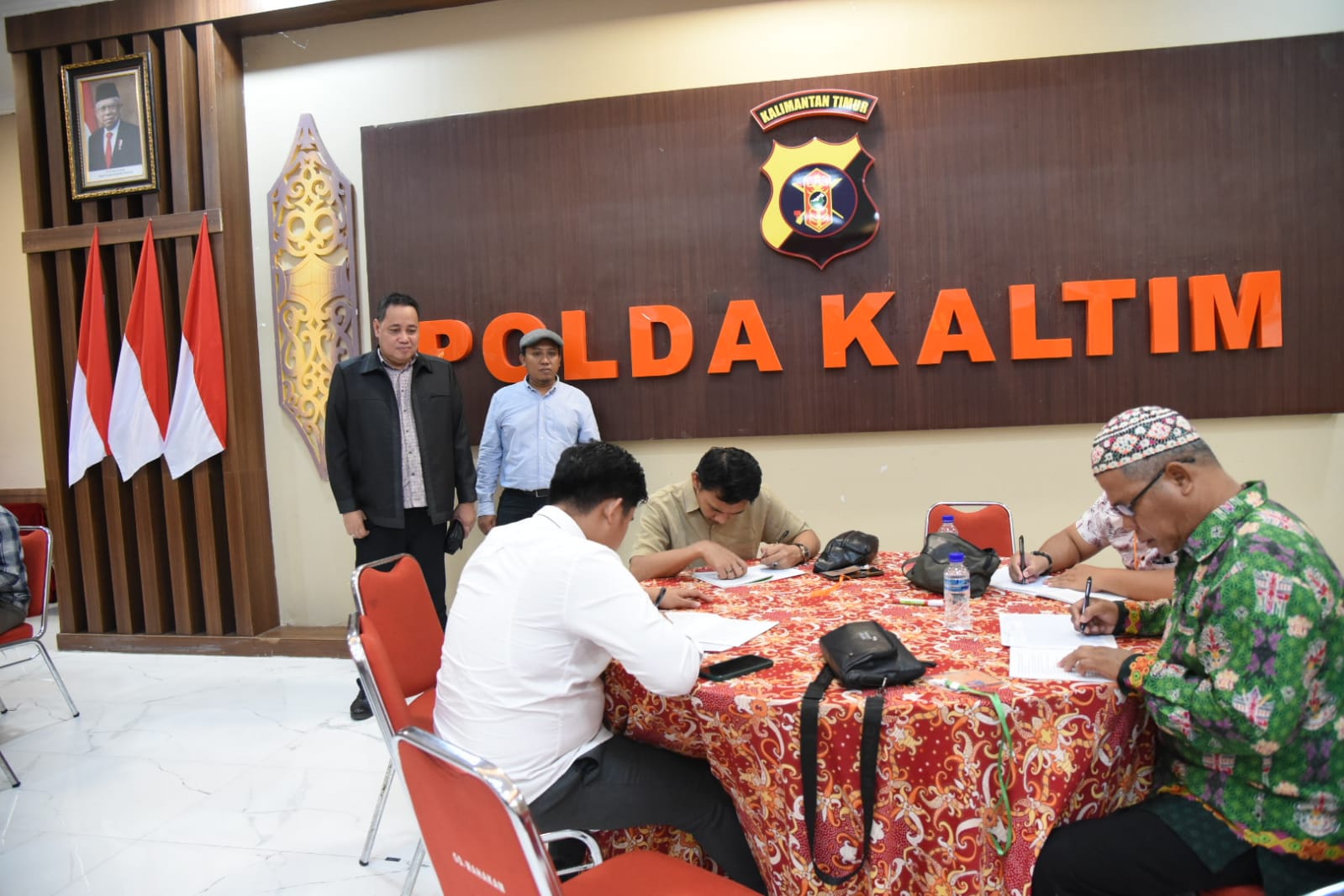Anggota Bawaslu Herwyn JH Malonda berdiskusi dengan timsel calon anggota Bawaslu Kabupaten/Kota Provinsi Kaltim dan tim dari Polda Kaltim di Kantor Polda Kaltim, Balikpapan, Jumat (15/7/2023).