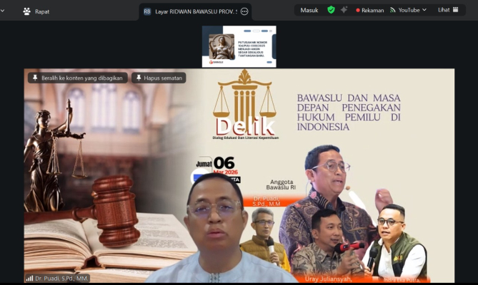 Anggota Bawaslu Puadi saat membuka Dialog Edukasi dan Literasi Kepemiluan DELIK secara daring yang diselenggarakan Bawaslu Provinsi Sulawesi Tenggara, Jumat (6/3/2026).