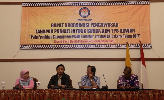 Bogor, Badan Pengawas Pemilihan Umum – Kurang dari 20 hari lagi pelaksanaan pemungutan suara Pemilihan Gubernur dan Wakil Gubernur DKI Jakarta. Dalam rangka meningkatkan kualitas pengawasan pada setiap tahapan pemilihan Gubernur dan Wakil Gubernur DKI Jakarta, Bawaslu Provinsi DKI Jakarta menggelar Rapat Koordinasi Pengawasan Tahapan Pungut Hitung Suara dan TPS Rawan pada Pemilihan Gubernur dan Wakil Gubernur DKI Jakarta 2017, di Ussu Hotel Cisarua, Bogor, Jawa Barat, Jumat (27/1).