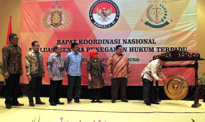 Bandung, Badan Pengawas Pemilu - Sentra Penegakan Hukum Terpadu (Gakkumdu) yang terdiri dari unsur Pengawas Pemilu, Kejaksaan, dan Kepolisian terus melakukan upaya penguatan sinergitas dalam rangka mengawal Pemilu di Indonesia. Guna mengevaluasi kinerja Sentra Gakkumdu, Bawaslu menggelar Rapat Koordinasi Nasional Evaluasi Sentra Penegakan Hukum Terpadu di Hotel Arya Duta Bandung sejak Selasa (23/5) hingga Kamis (25/5).