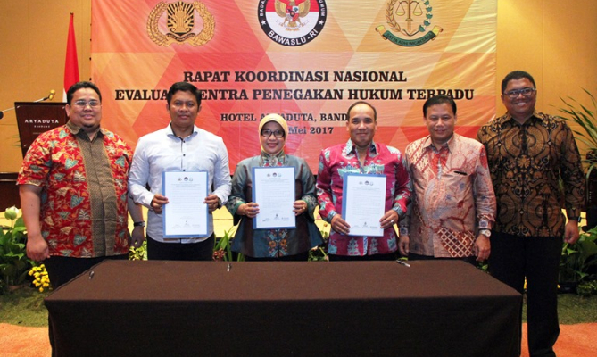 Bandung, Badan Pengawas Pemilu - Rapat Koordinasi Nasional (Rakornas) Evaluasi Sentra Penegakan Hukum Terpadu (Gakkumdu) Pemilihan Gubernur, Bupati, dan Walikota tahun 2017 menghasilkan Piagam Bandung yang berupa komitmen bersama antara Pengawas Pemilu, Kepolisian, dan Kejaksaan dalam membangun sinergitas mengawal pelaksanaan Pemilu di Indonesia.